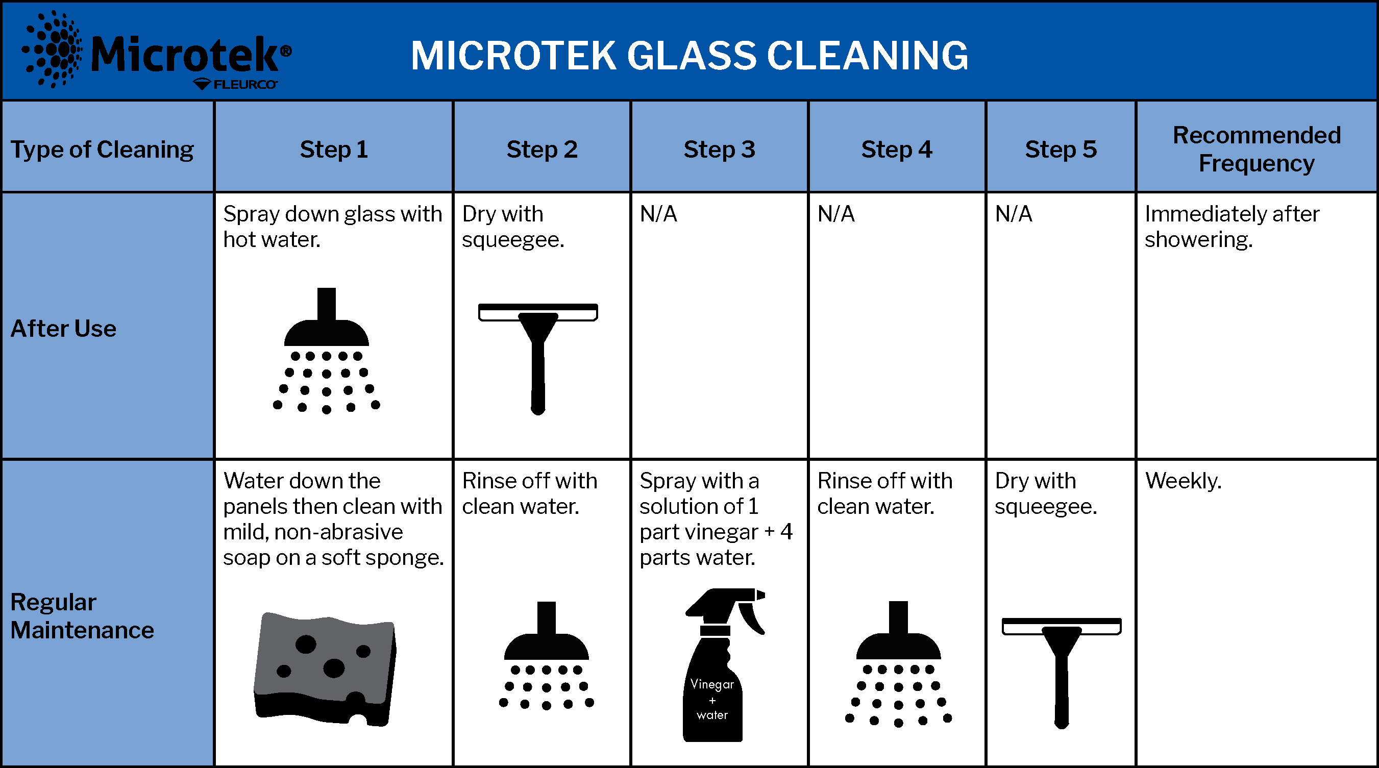 Over time, everyday products like shampoos and soaps can cause mineral deposits to accumulate on your shower door. Fleurco’s glass protecting technology alleviates the need for scrubbing and frequent cleaning between showers, as well as the use of harsh toxic cleaners therefore making it an Eco-friendly solution. Microtek® will keep your shower door in optimal condition thus creating a more hygienic shower space, for up to 10 years. With Fleurco’s Microtek® repellent coating, minimal cleaning is required allowing you to enjoy a relaxing and serene shower experience.
